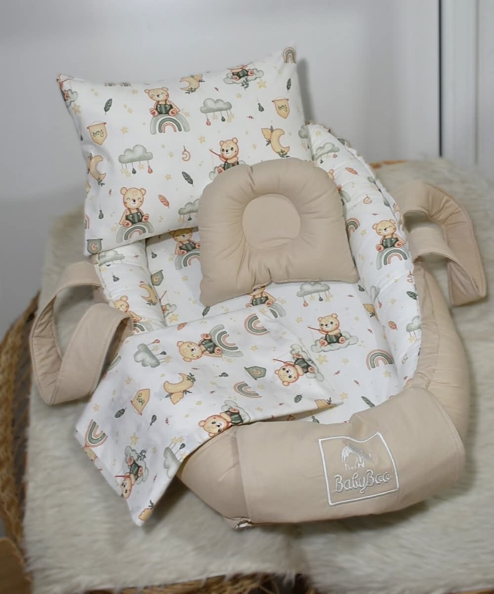 Découvrez le cocon bébé Beige “Ourson Arc-en-ciel” – BabyBoo, un modèle unisexe conçu pour offrir à votre nouveau-né un confort optimal et une sécurité rassurante.