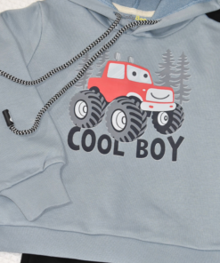 Le sweat bleu gris met en avant un camion rouge adorable façon ” Monster truck” , un motif apprécié par les enfants. Le pantalon noir apporte une touche classique et pratique pour une tenue quotidienne complète.