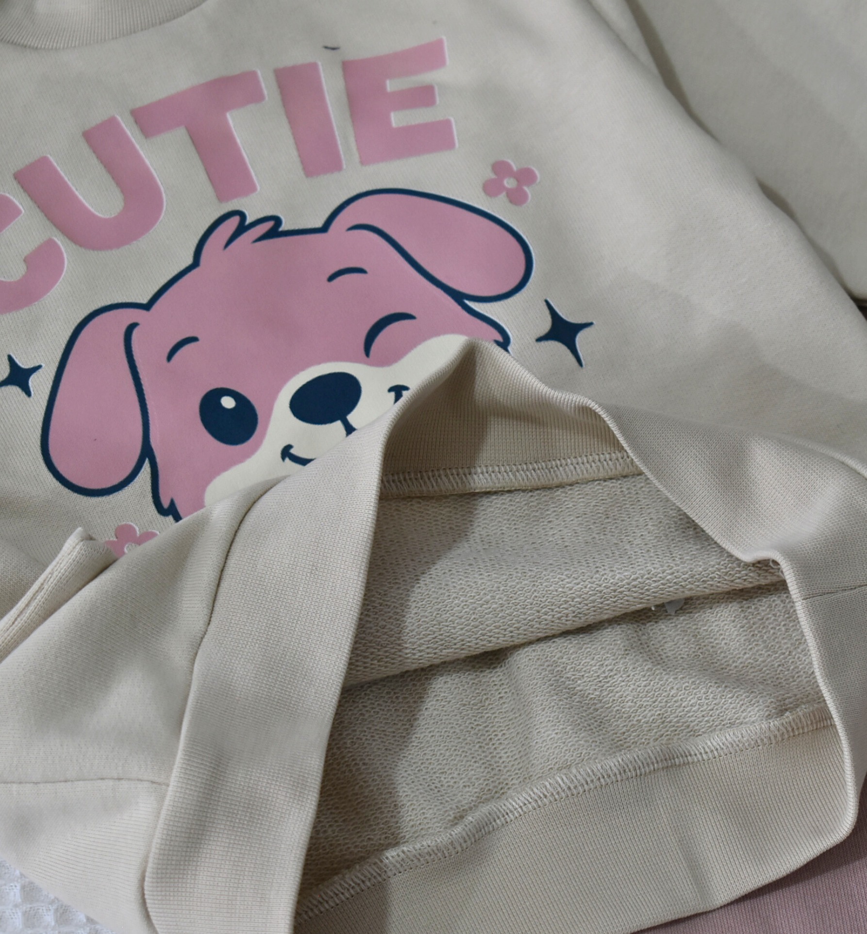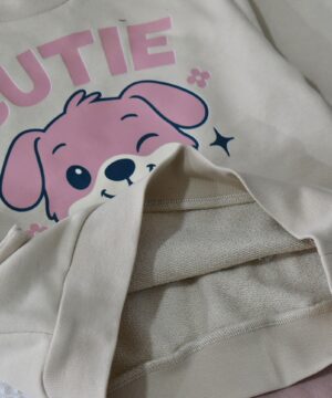 Le sweat beige est décoré d’un adorable chiot au sourire malicieux, dans de jolies teintes pastel.