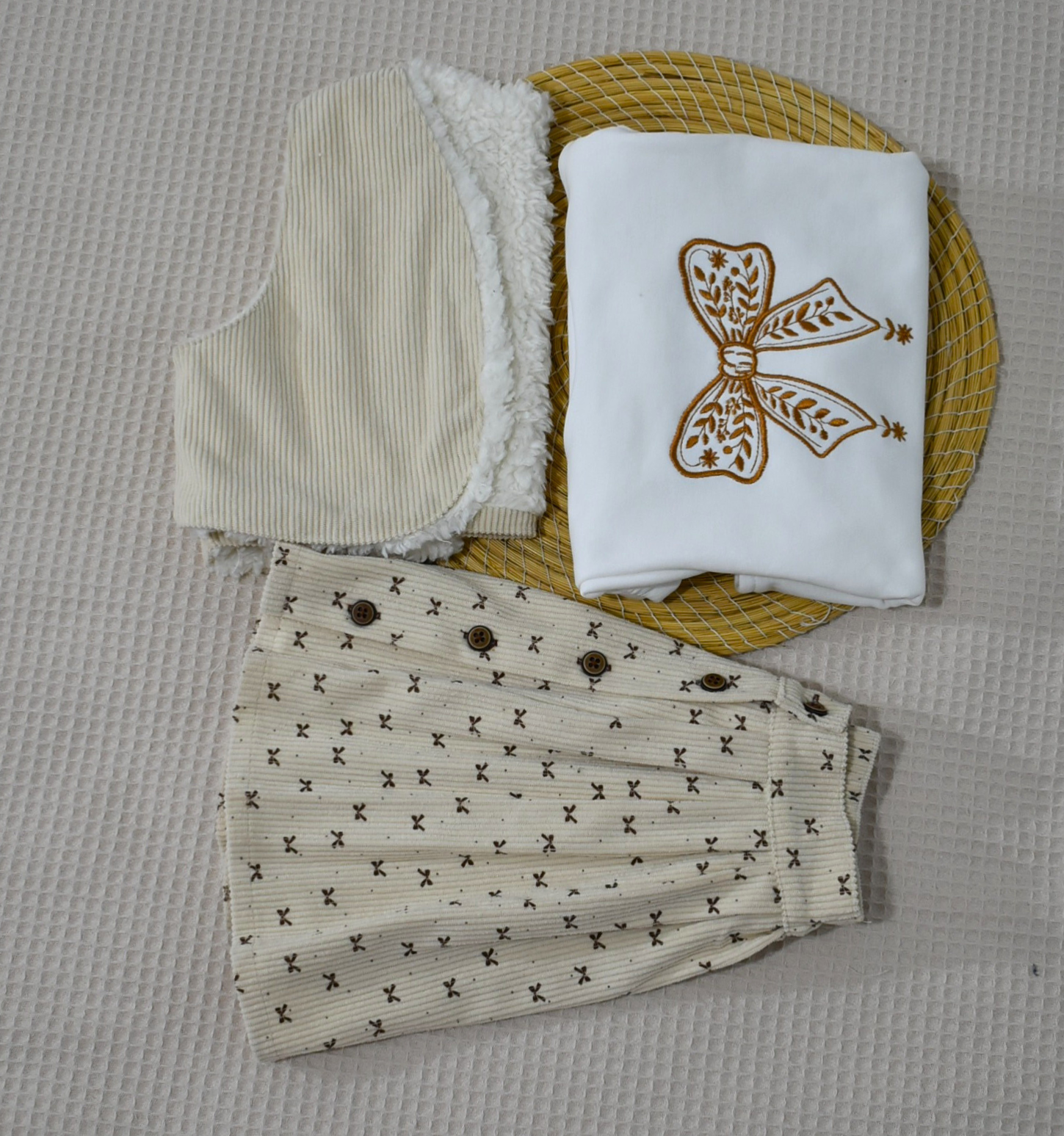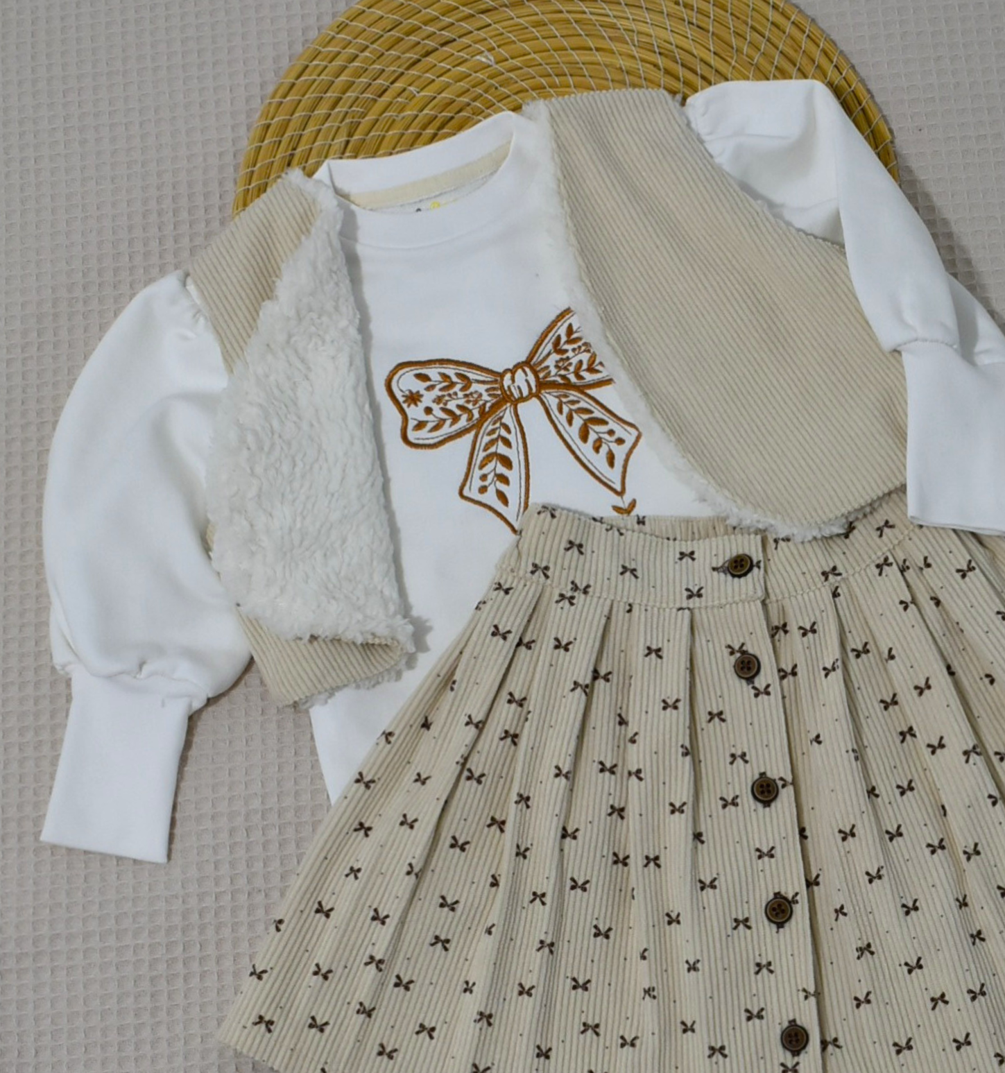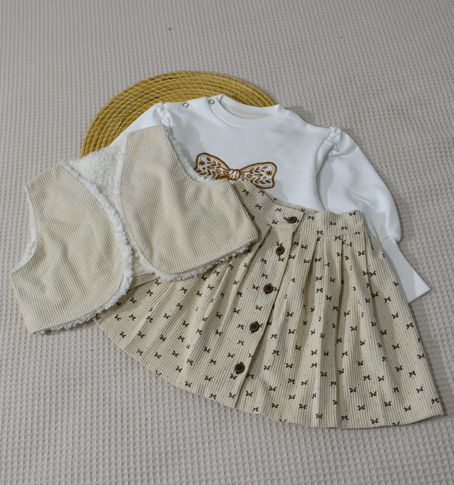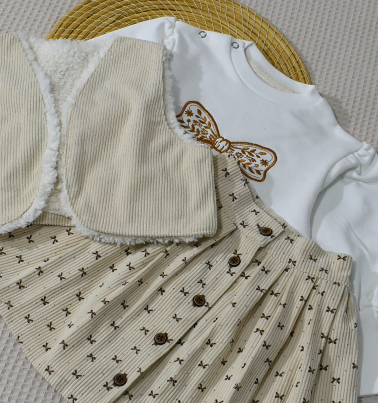 Un ensemble bébé fille doux et élégant, composé d’un sweat brodé, d’une jupe et d’un gilet chaud en velours côtelé (Gatiffa).