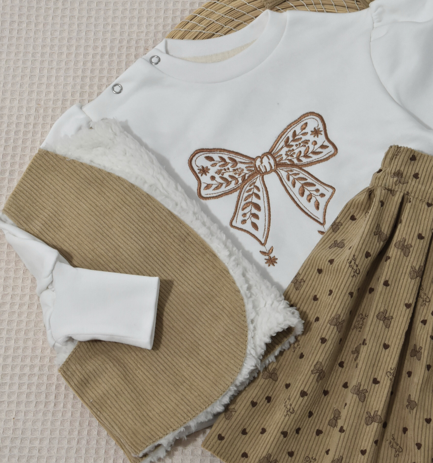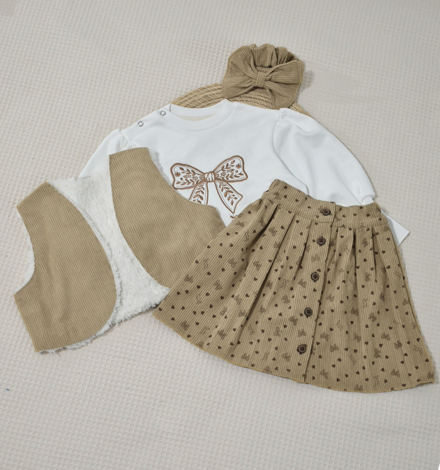 Ensemble élégant pour fille composé d’un pull blanc en coton, d’une jupe en velours côtelé imprimé ( Gatiffa) et d’un gilet assorti, avec bandeau nœud inclus.