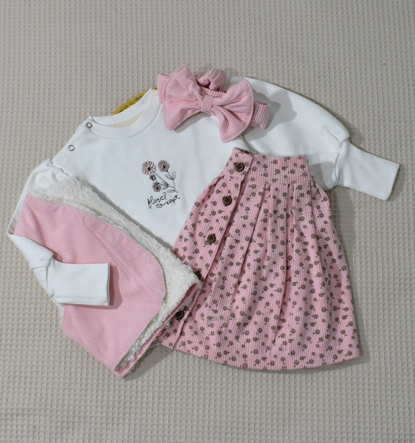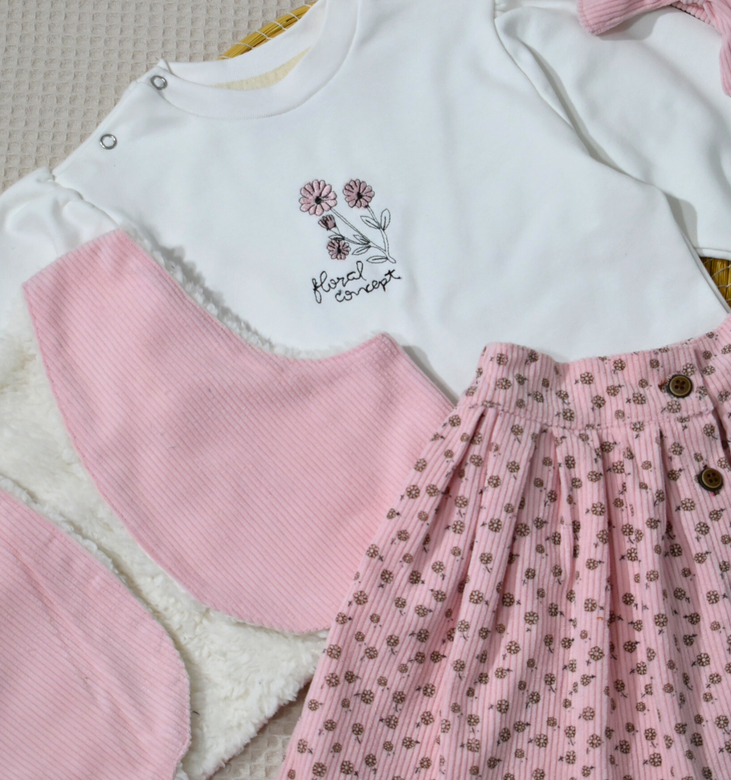 Ensemble fille – Jupe rose imprimée & pull molleton gratté