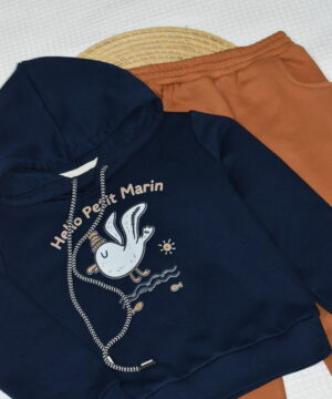 Le sweat à capuche bleu marine est décoré d’un joli motif mouette cartoon avec l’inscription “Hello Petit Marin”, apportant un look joyeux et original. Le pantalon jogging couleur rouille est confortable et pratique pour accompagner l’enfant au quotidien.