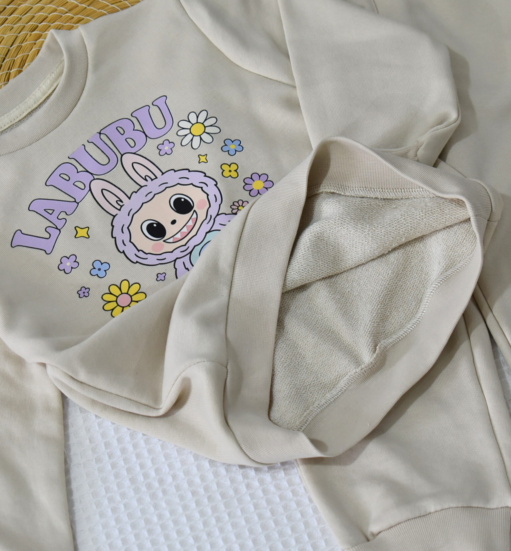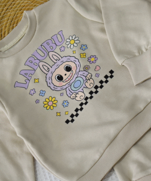 Le sweat beige est décoré d’un joli motif bunny cartoon entouré de petites fleurs pastel, offrant un look joyeux et mignon.