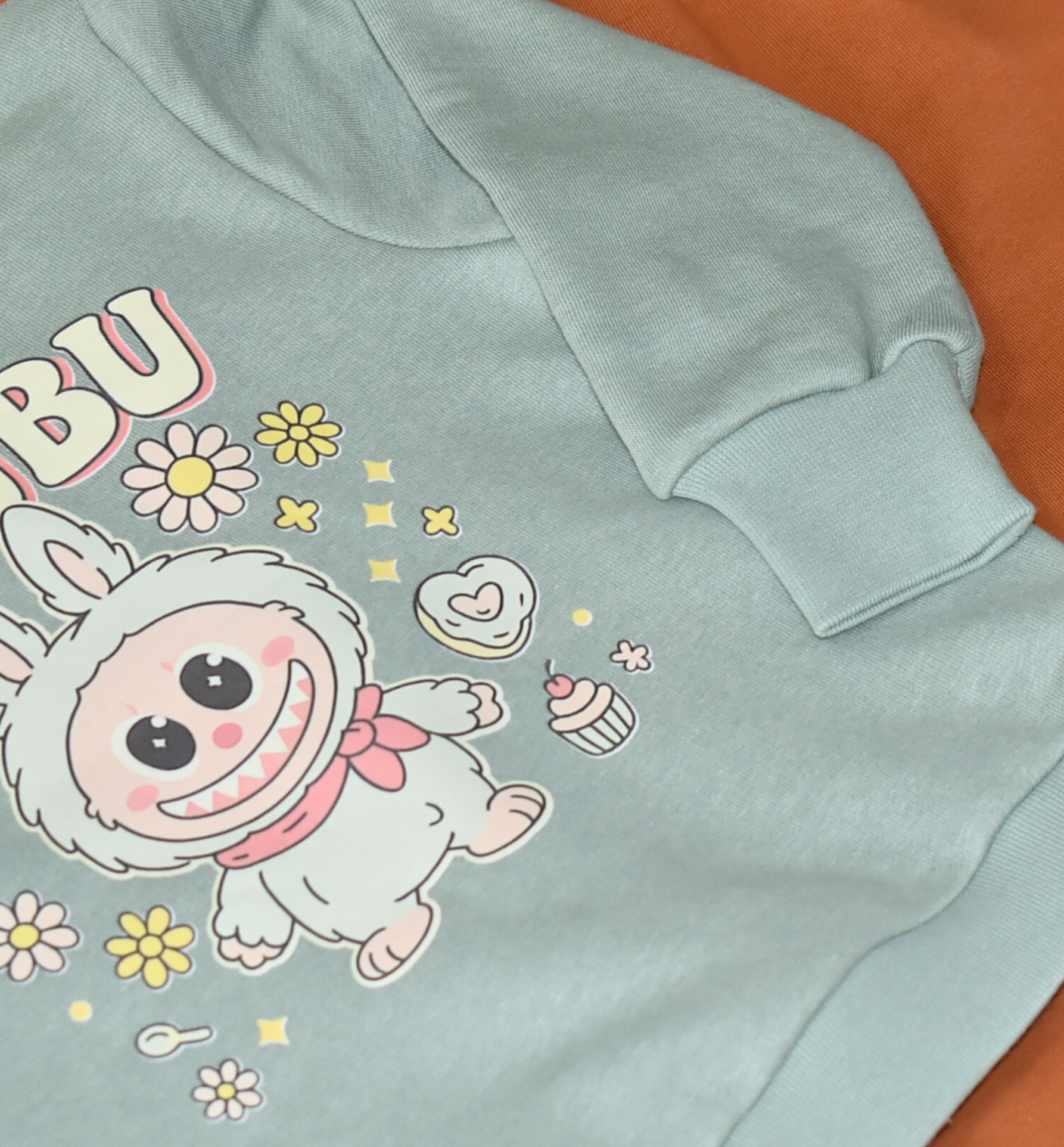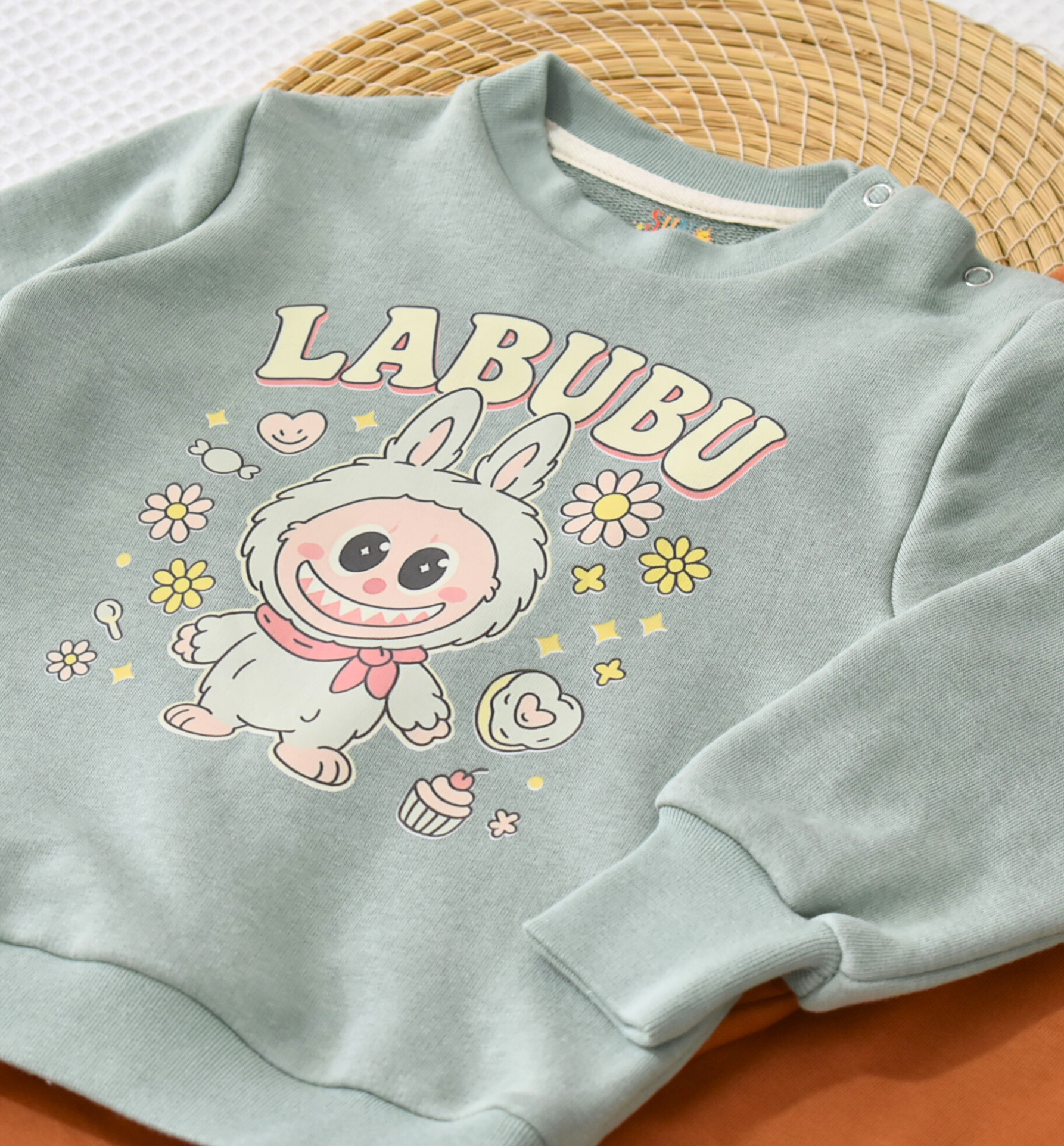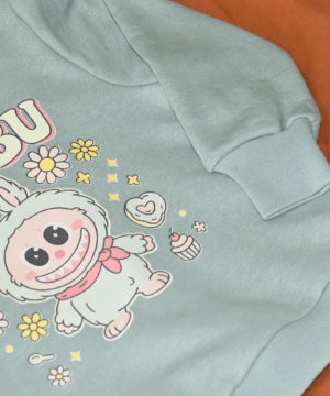 Le sweat vert sauge est décoré d’un motif lapin cartoon entouré de petites fleurs pastel, offrant un look joyeux et enfantin.