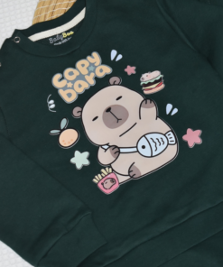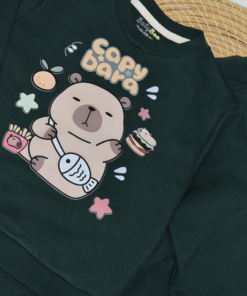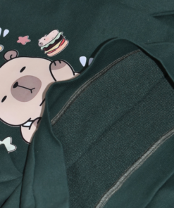 Le sweat vert foncé est décoré d’un motif capybara cartoon trop mignon, entouré de petites illustrations ludiques.