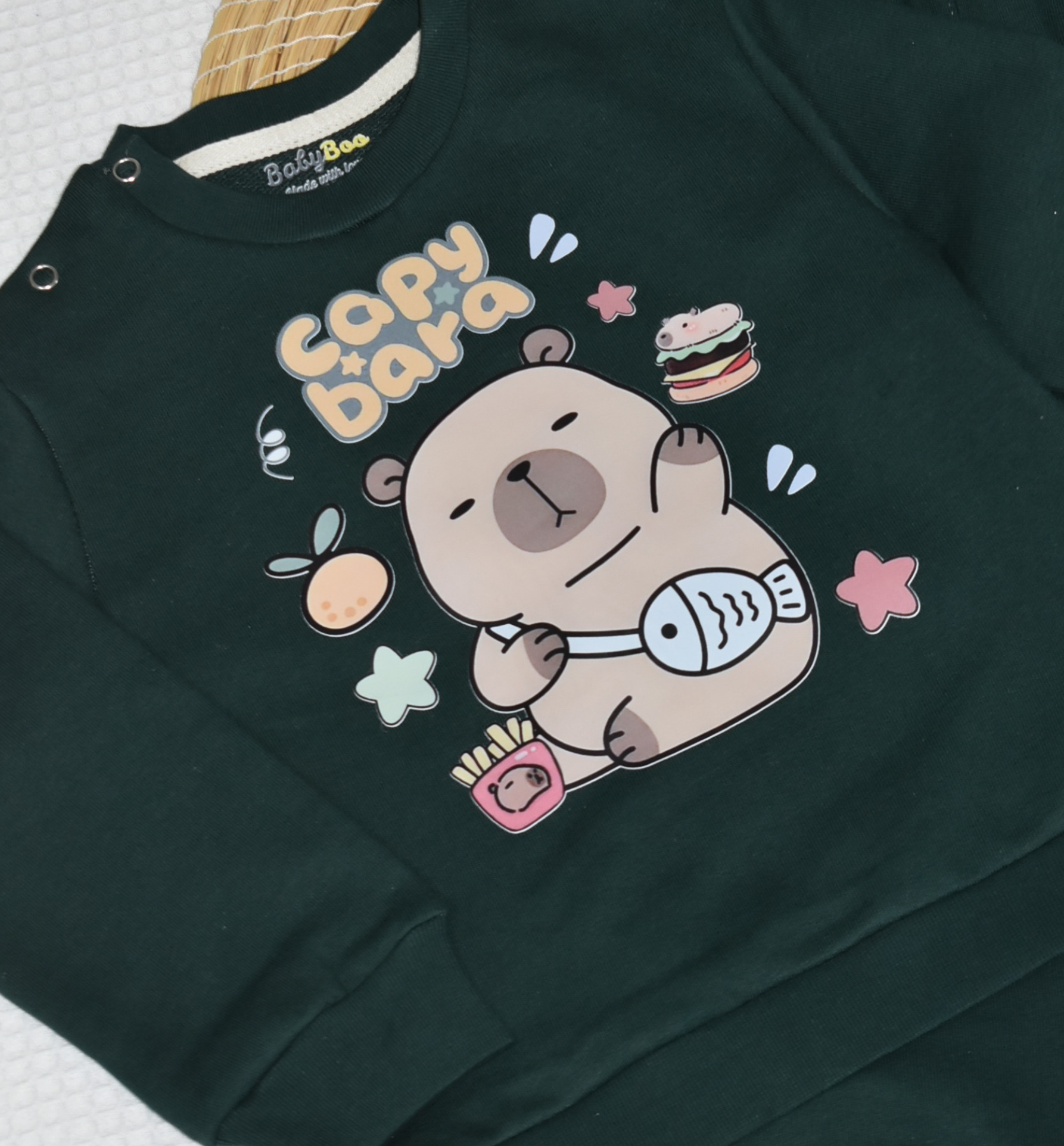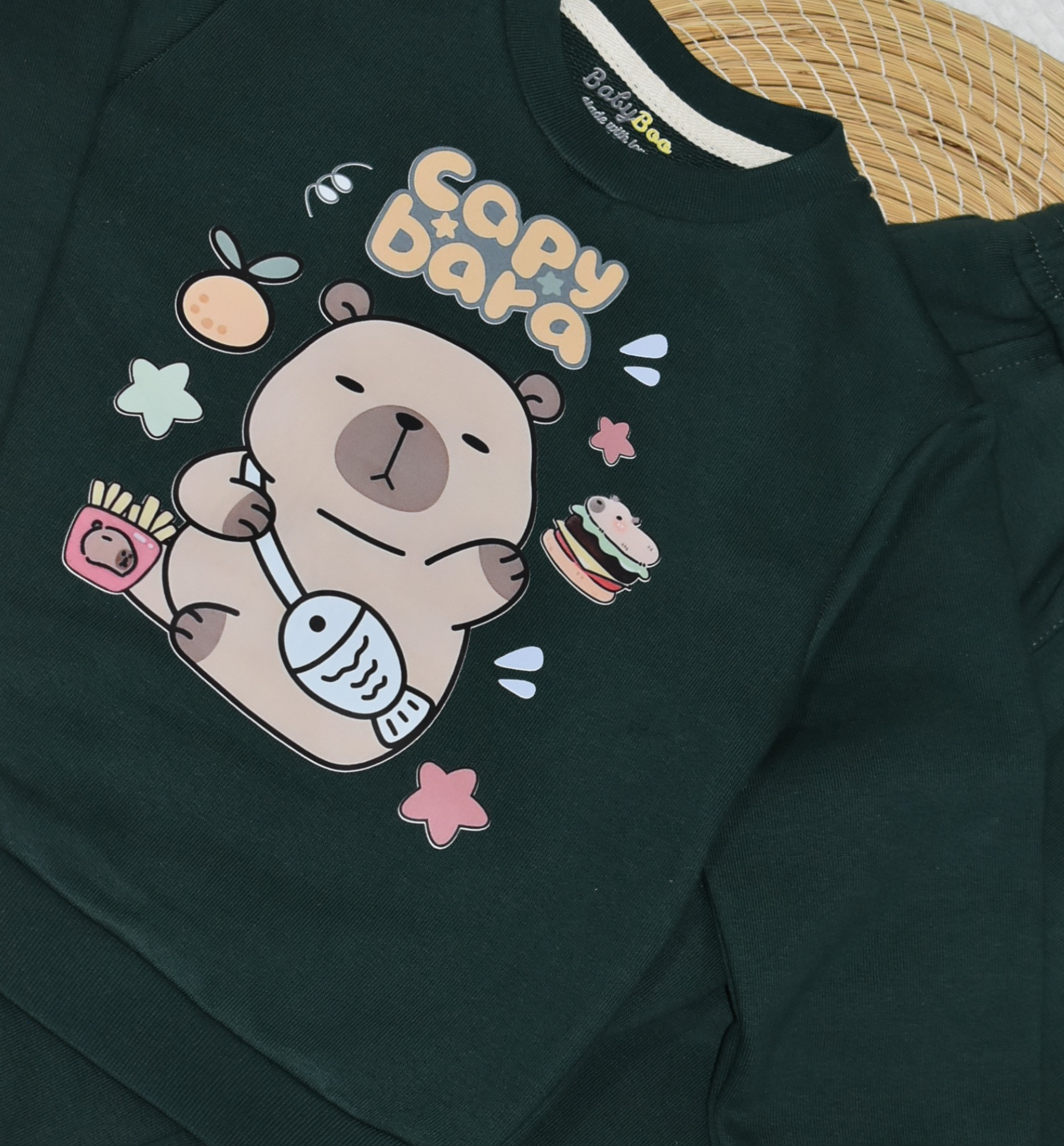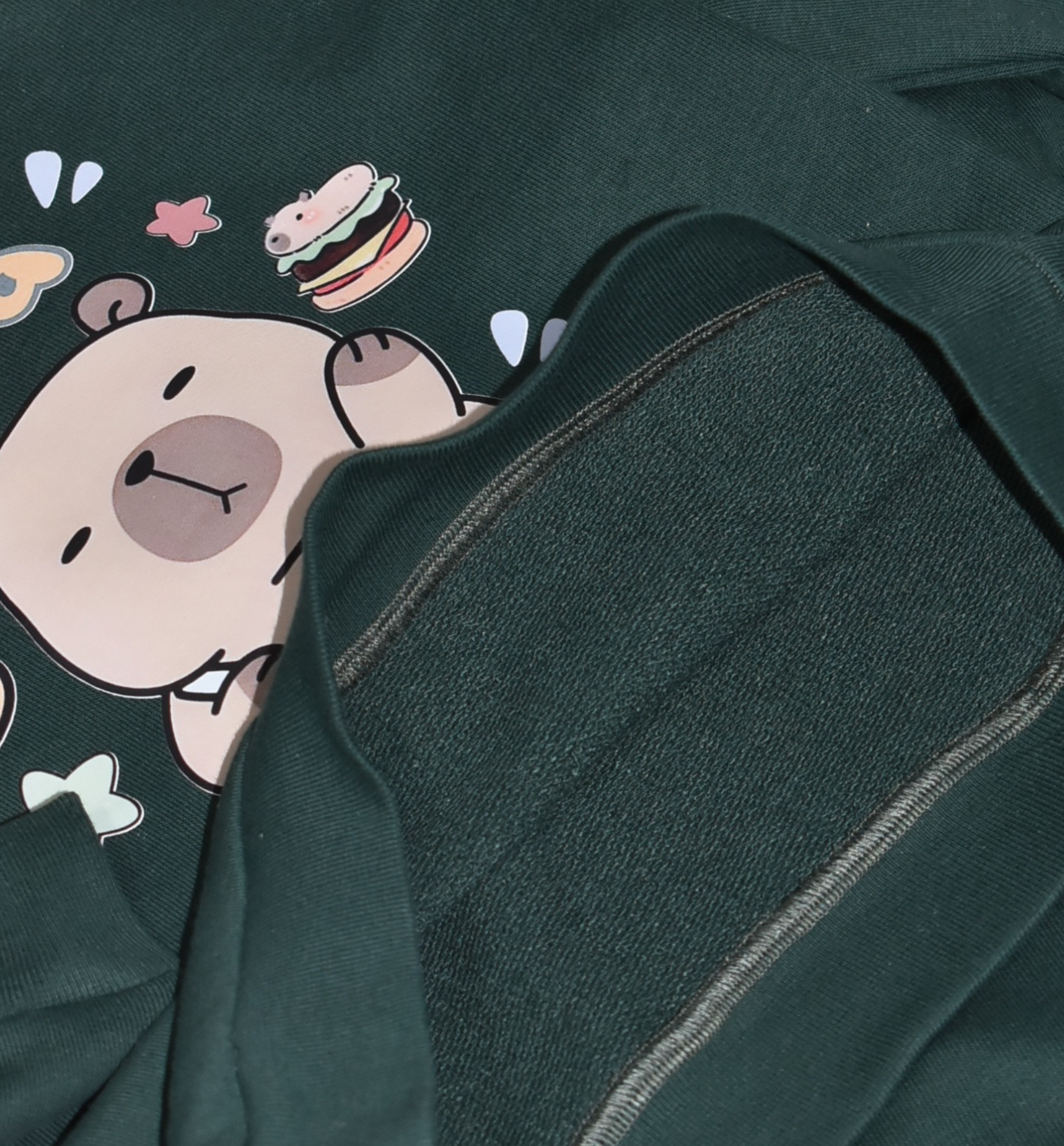 Le sweat vert foncé est décoré d’un motif capybara cartoon trop mignon, entouré de petites illustrations ludiques.