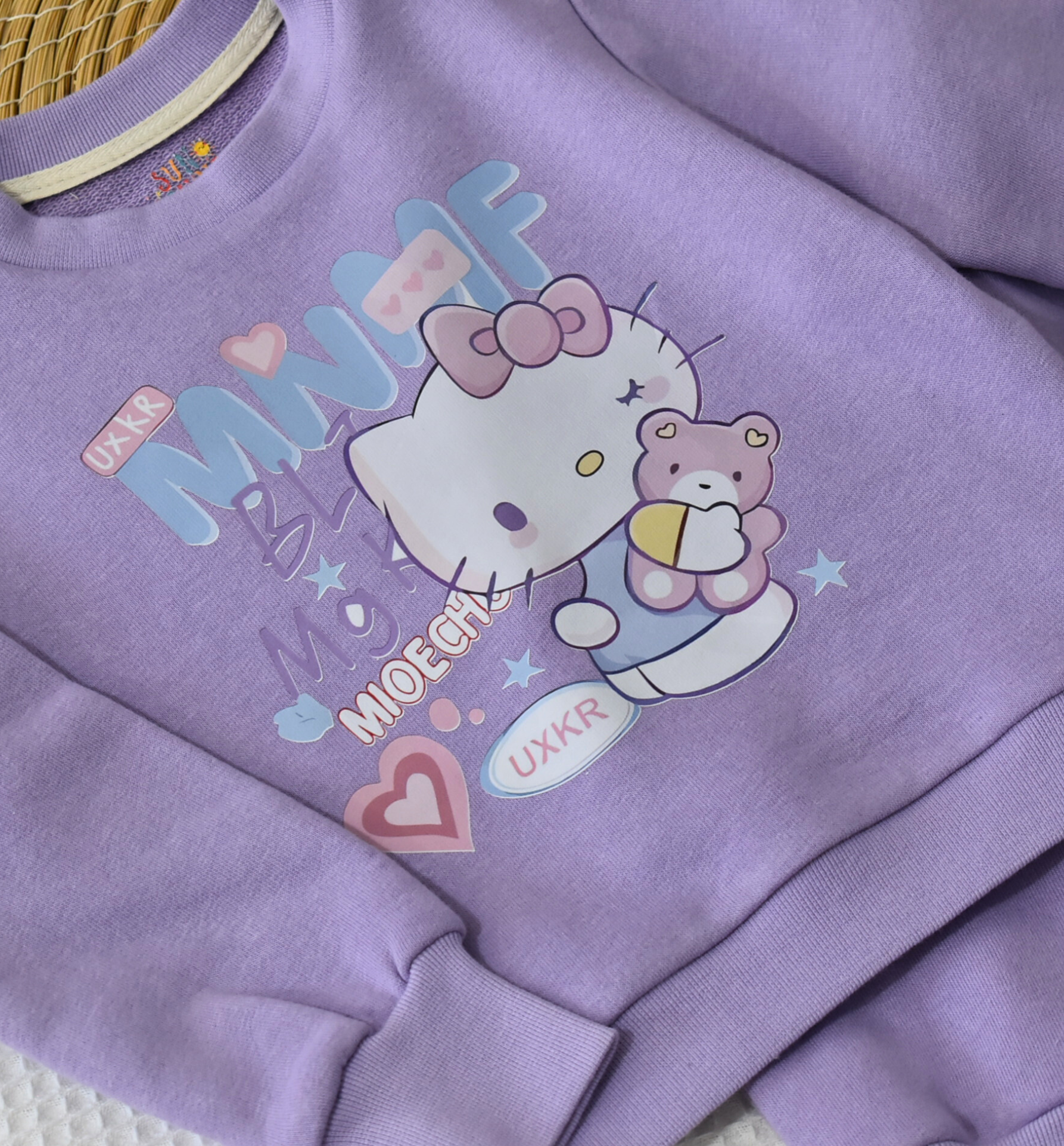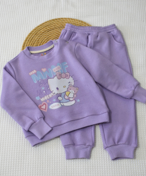 Le haut présente un motif chat mignon aux couleurs tendres, accompagné d’un pantalon assorti avec taille élastique pour un confort optimal.