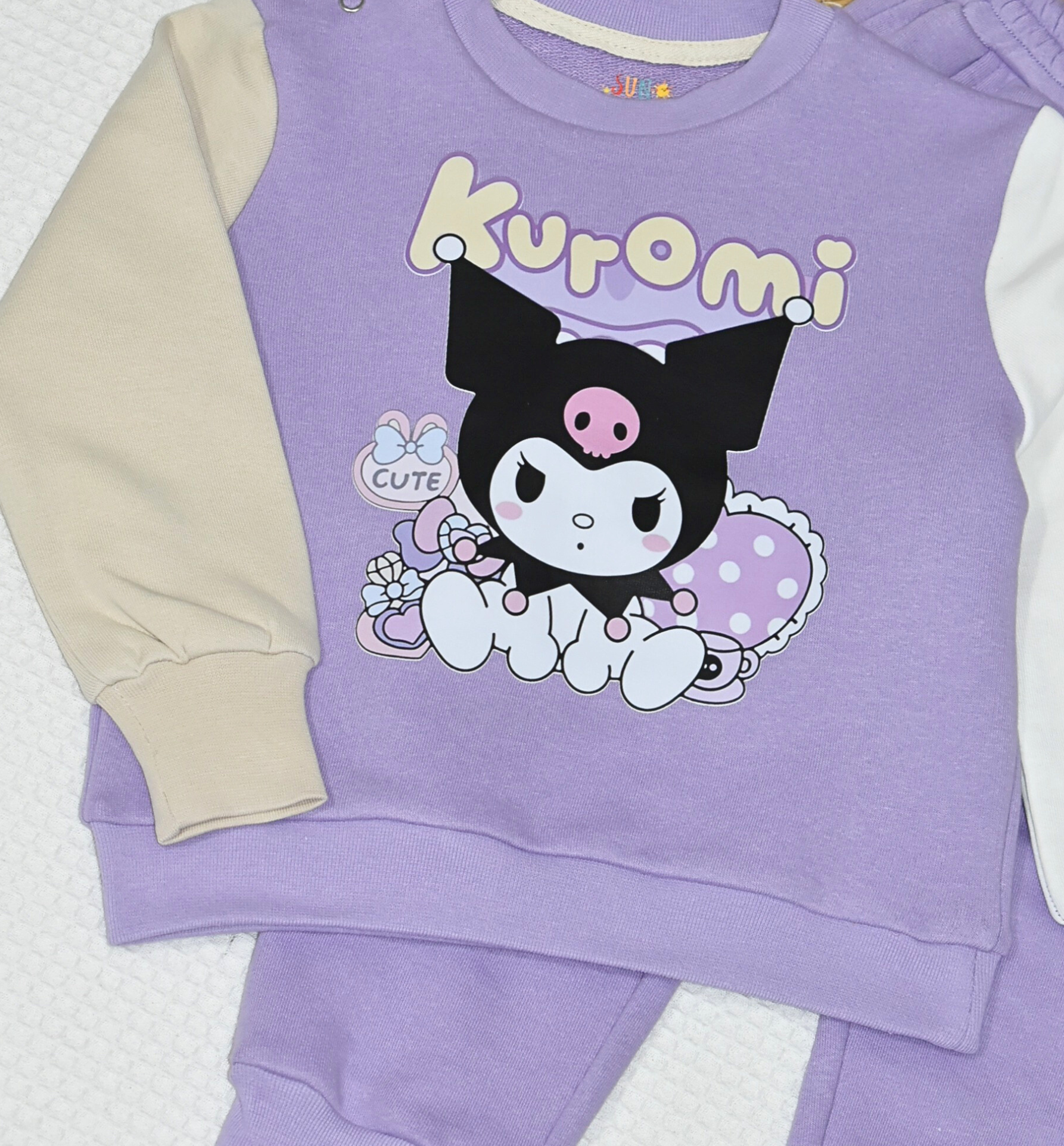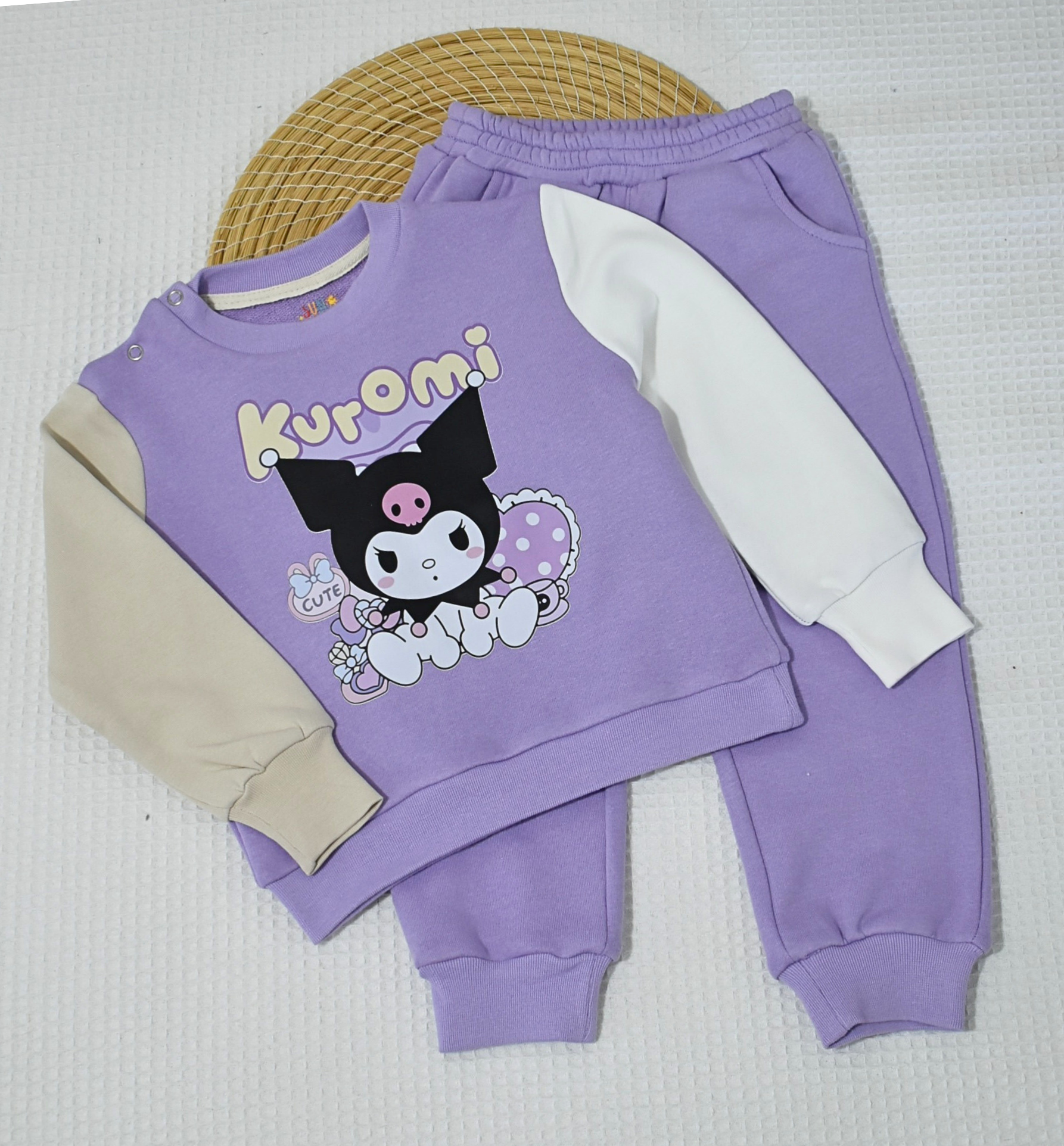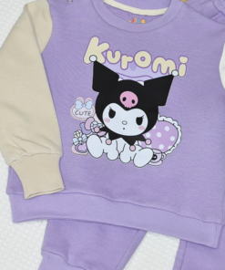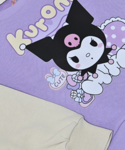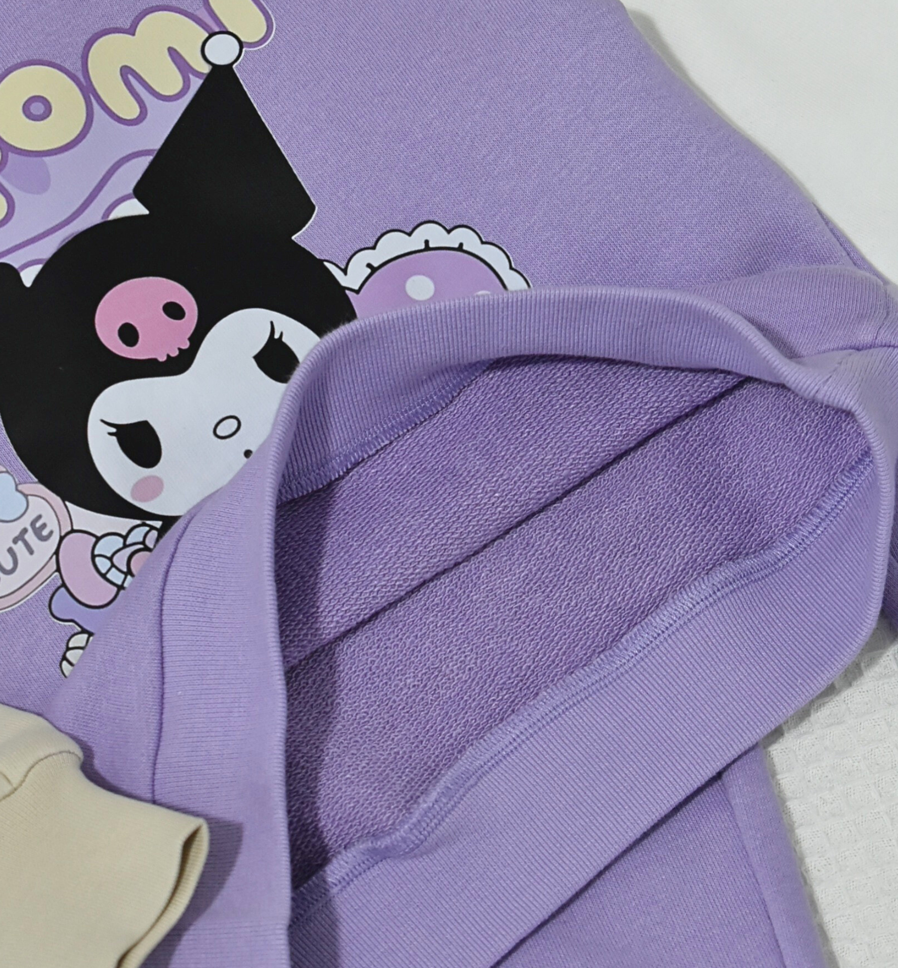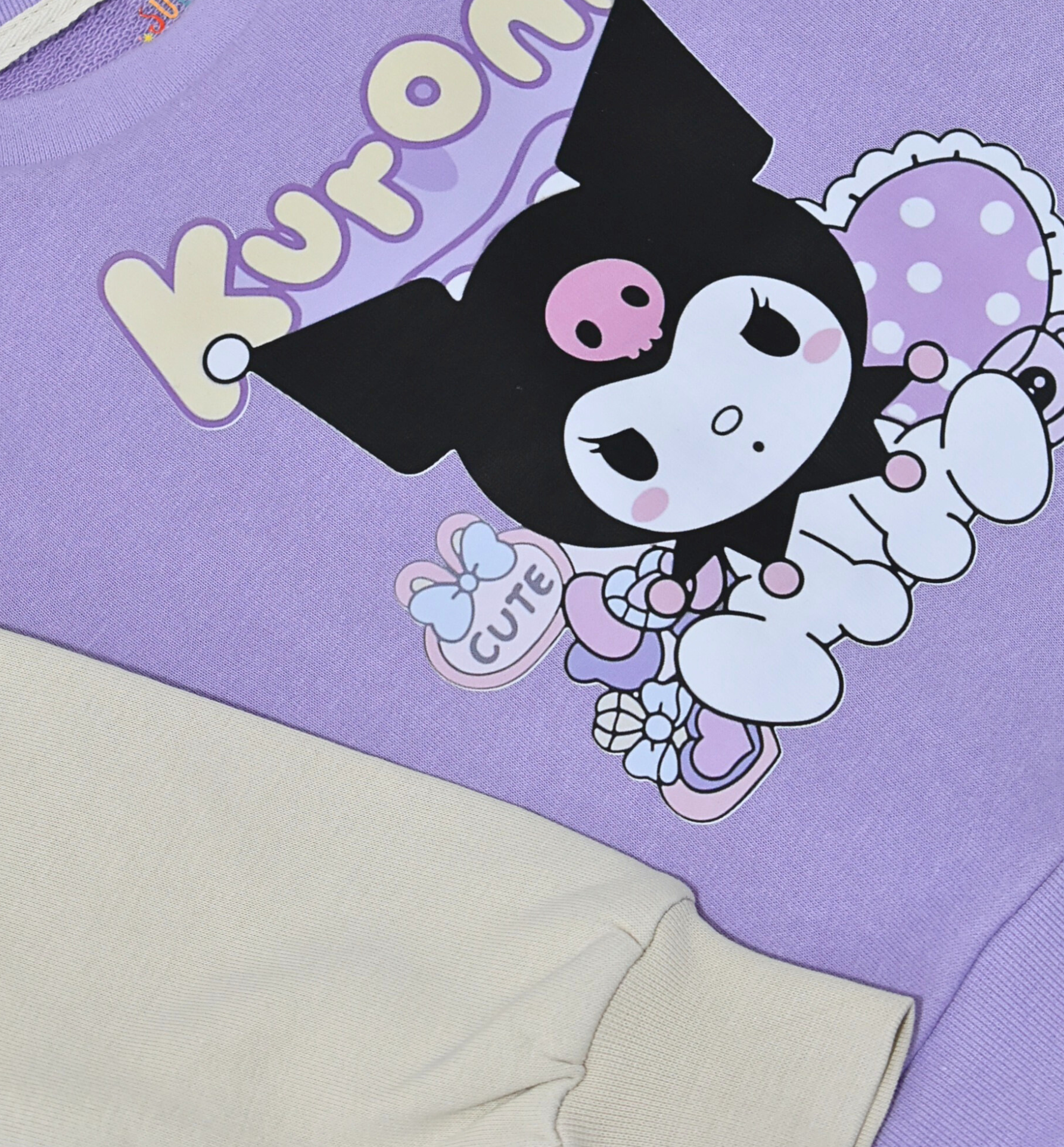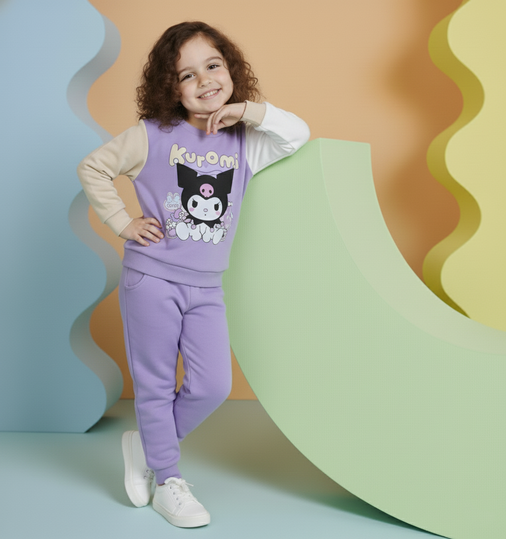 Le sweat violet pastel est décoré d’un joli motif cartoon au centre et de manches bicolores (beige + blanc), offrant un look moderne et adorable. Le pantalon jogging violet assorti assure confort et liberté de mouvement tout au long de la journée.