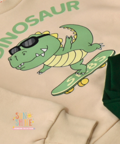 Le sweat beige est décoré d’un adorable dinosaure cartoon en mode skateur, avec une typographie verte qui apporte une touche dynamique.