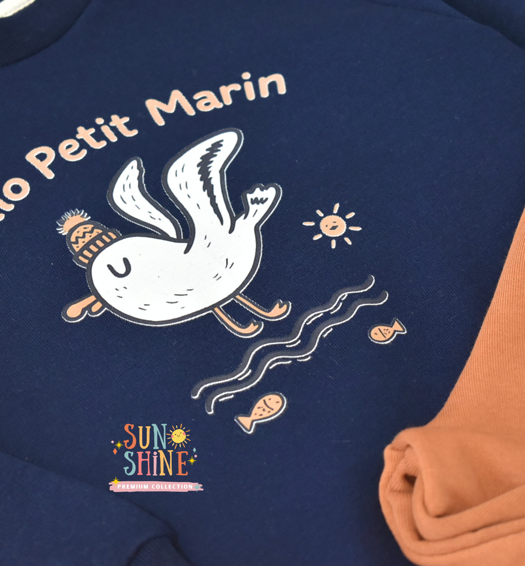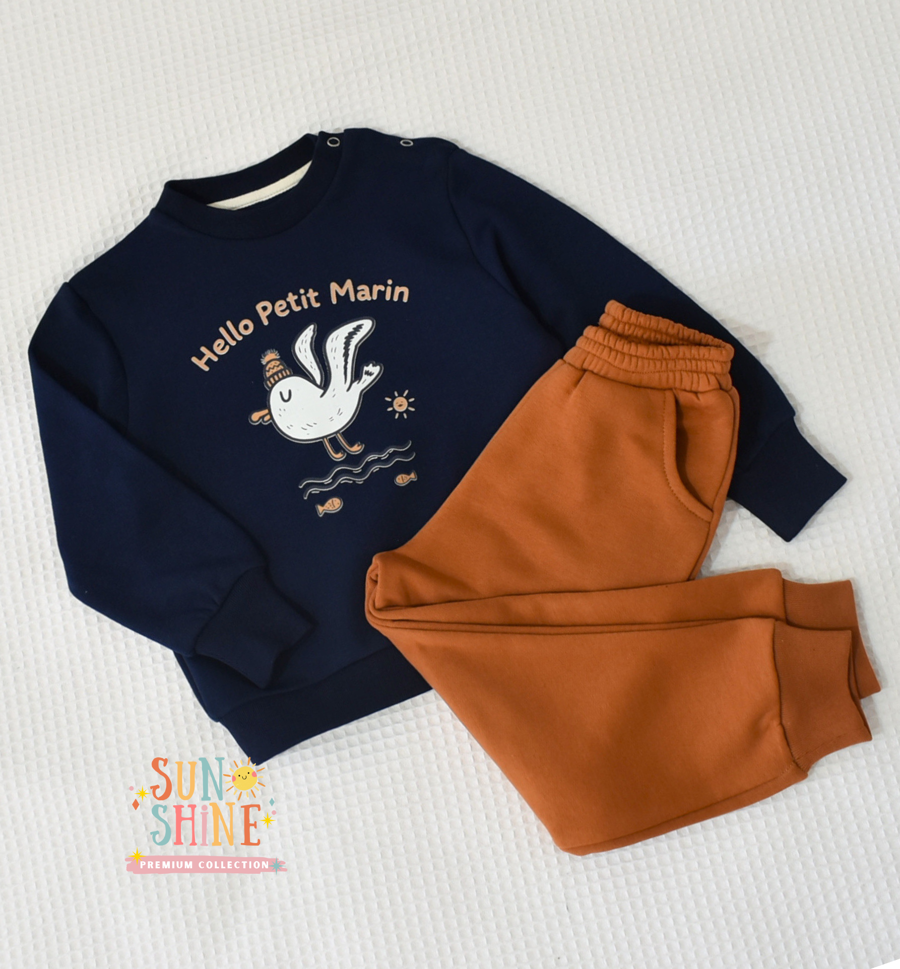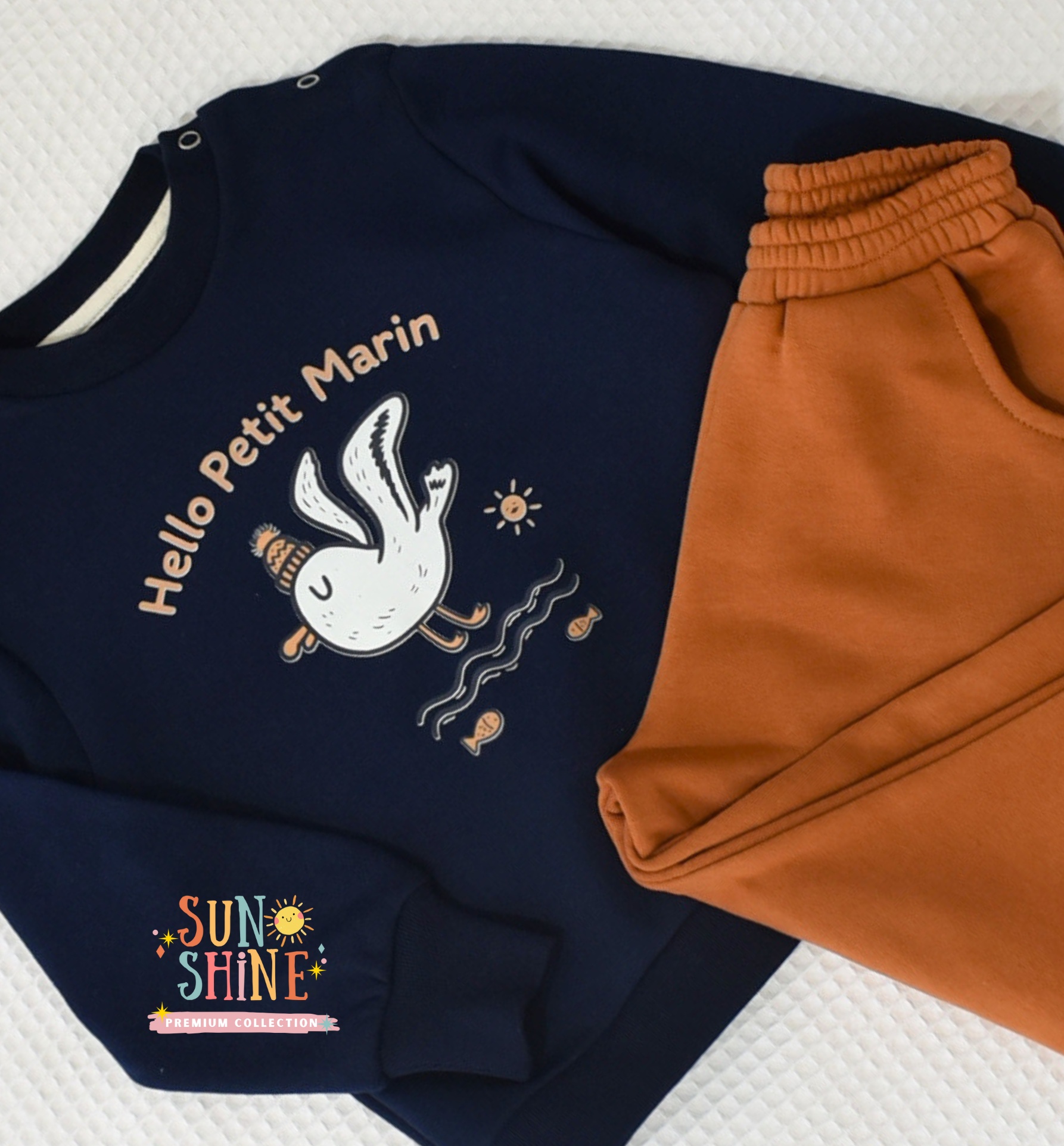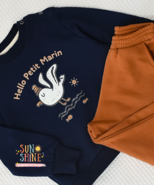 Le sweat bleu marine est décoré d’un joli motif mouette cartoon avec l’inscription “Hello Petit Marin”, apportant un look joyeux et original. Le pantalon jogging couleur rouille est confortable et pratique pour accompagner l’enfant au quotidien.