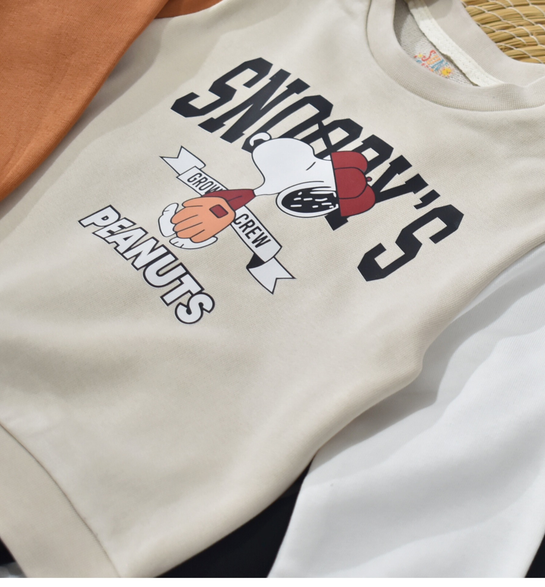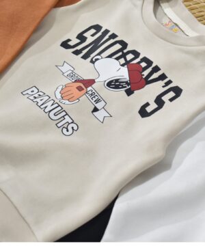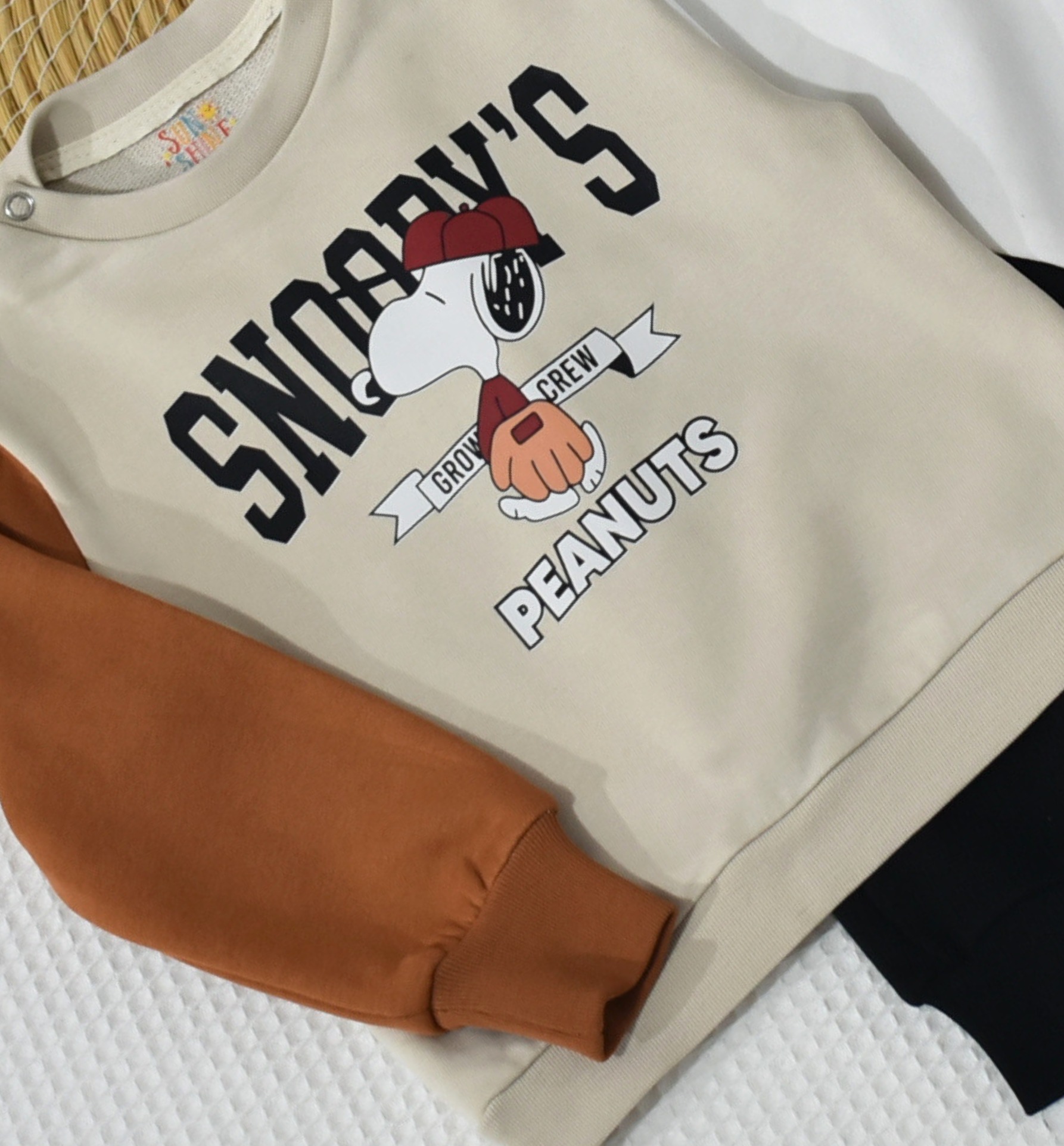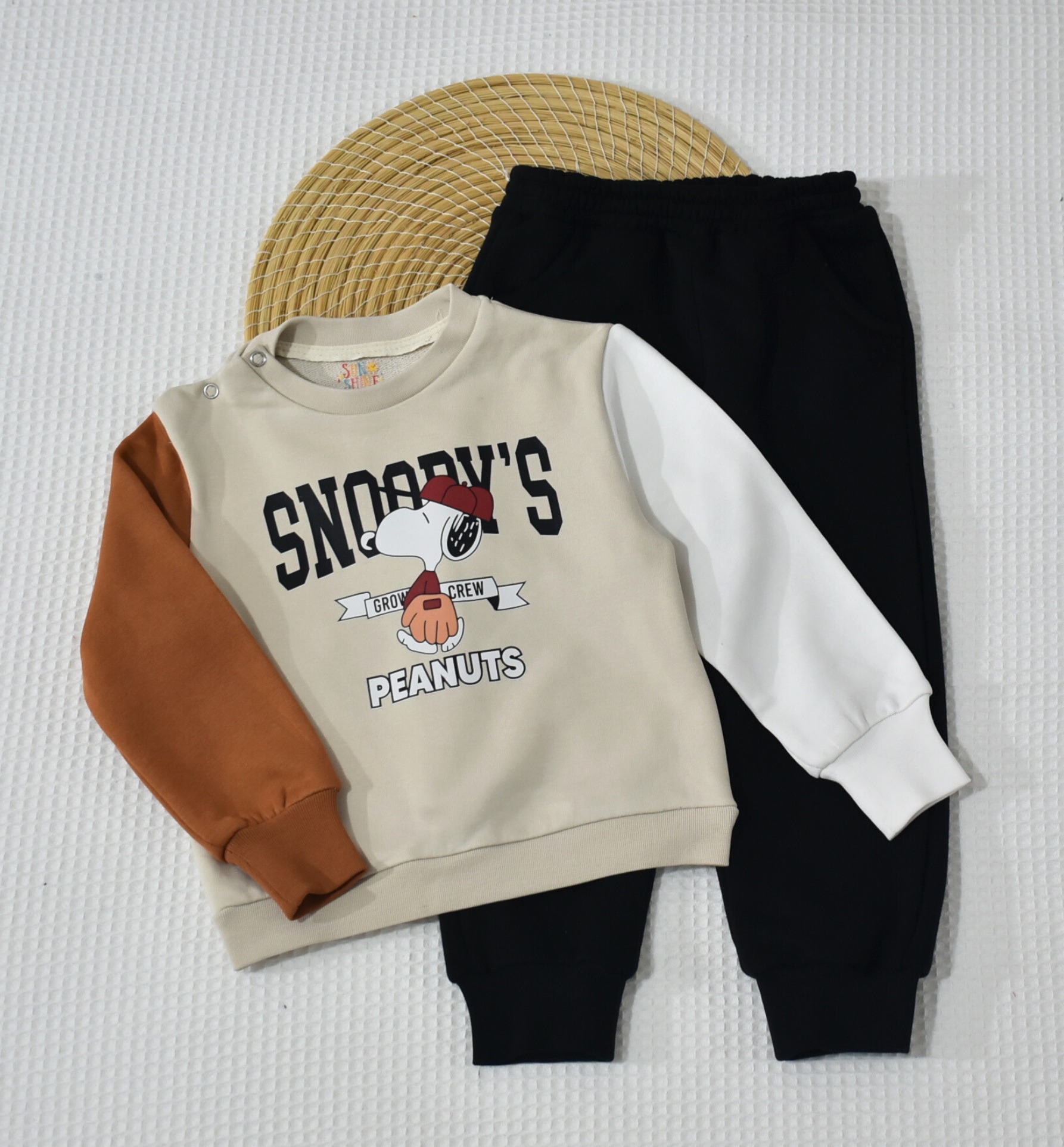 Ensemble jogging bébé & enfant en molleton doux PUR COTON , composé d’un sweat bicolore motif S-NOOPY cartoon style street et d’un pantalon jogging noir à taille élastiquée.