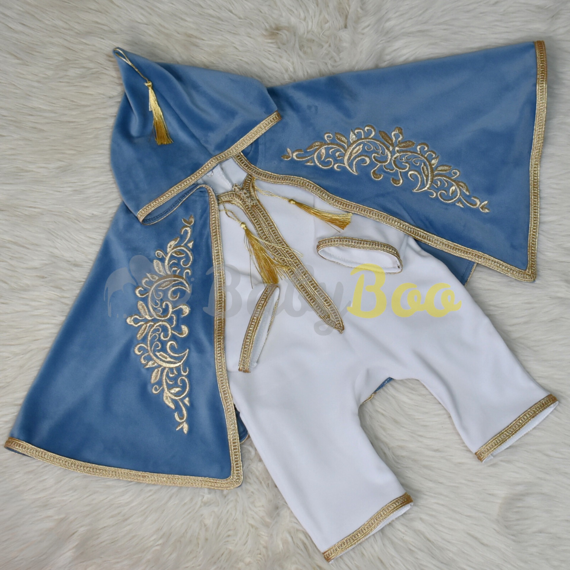 La cape en velours bleu pastel , douce comme une caresse, est ornée de broderies dorées délicates qui rappellent les tenues orientales raffinées.