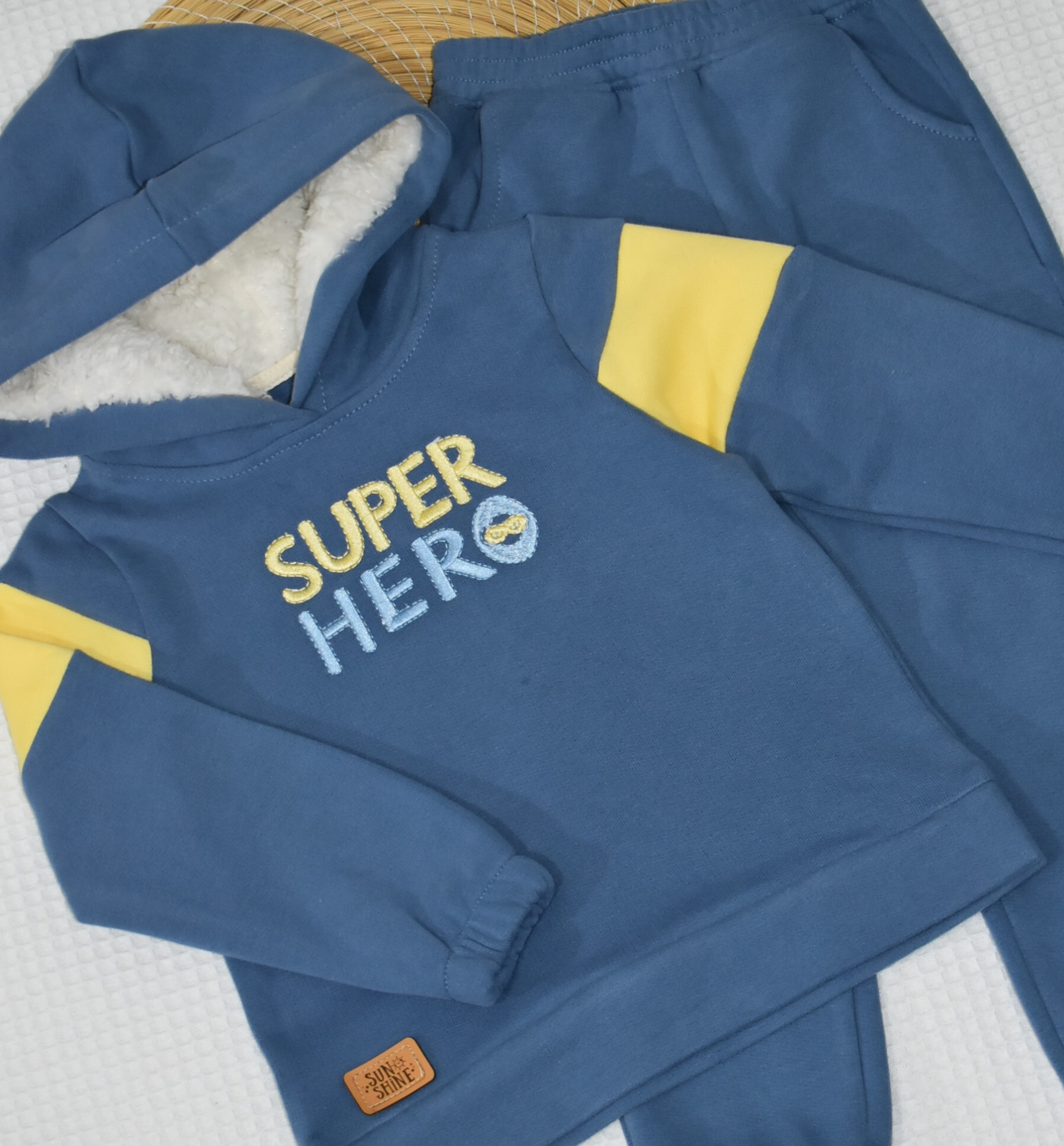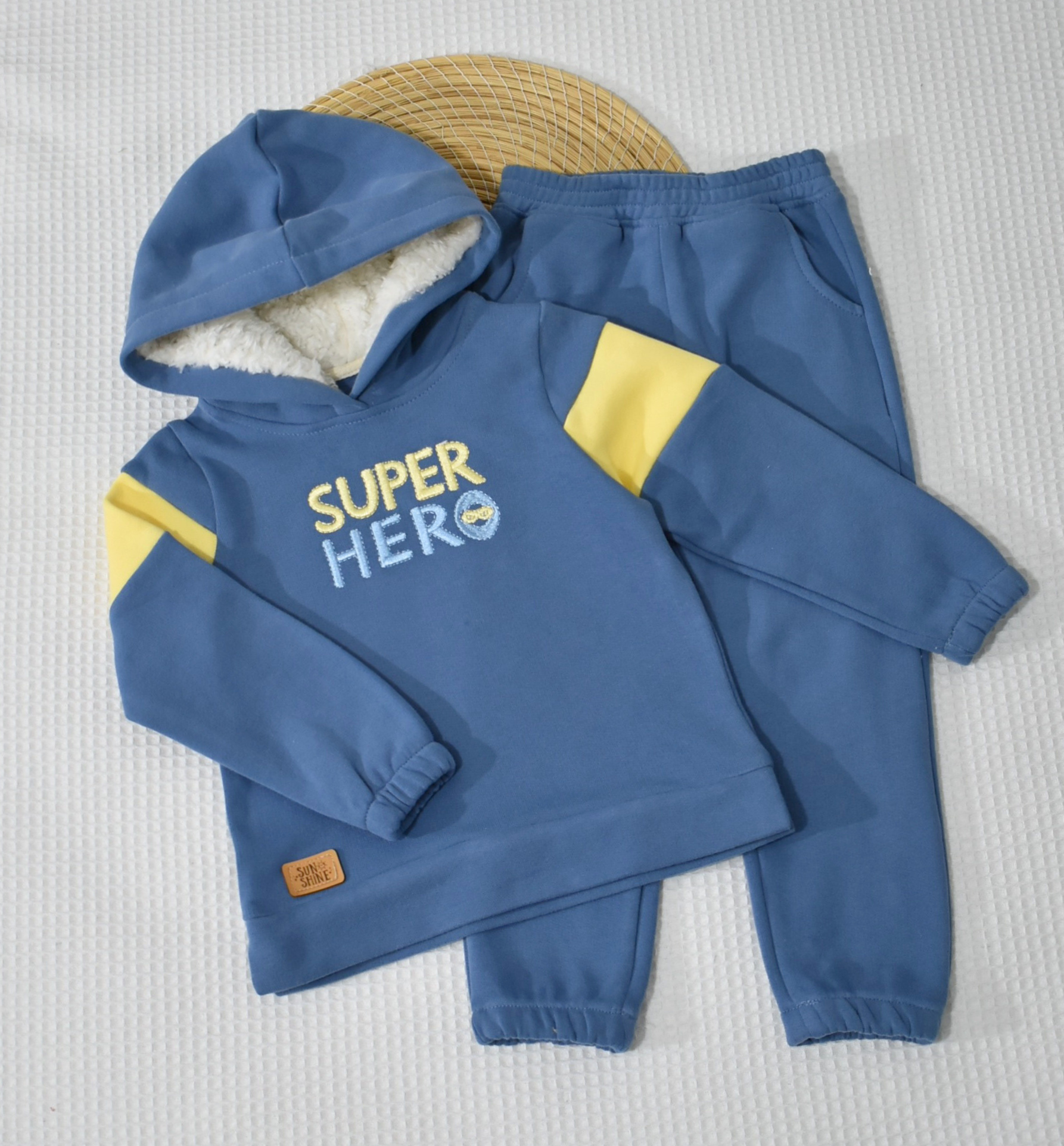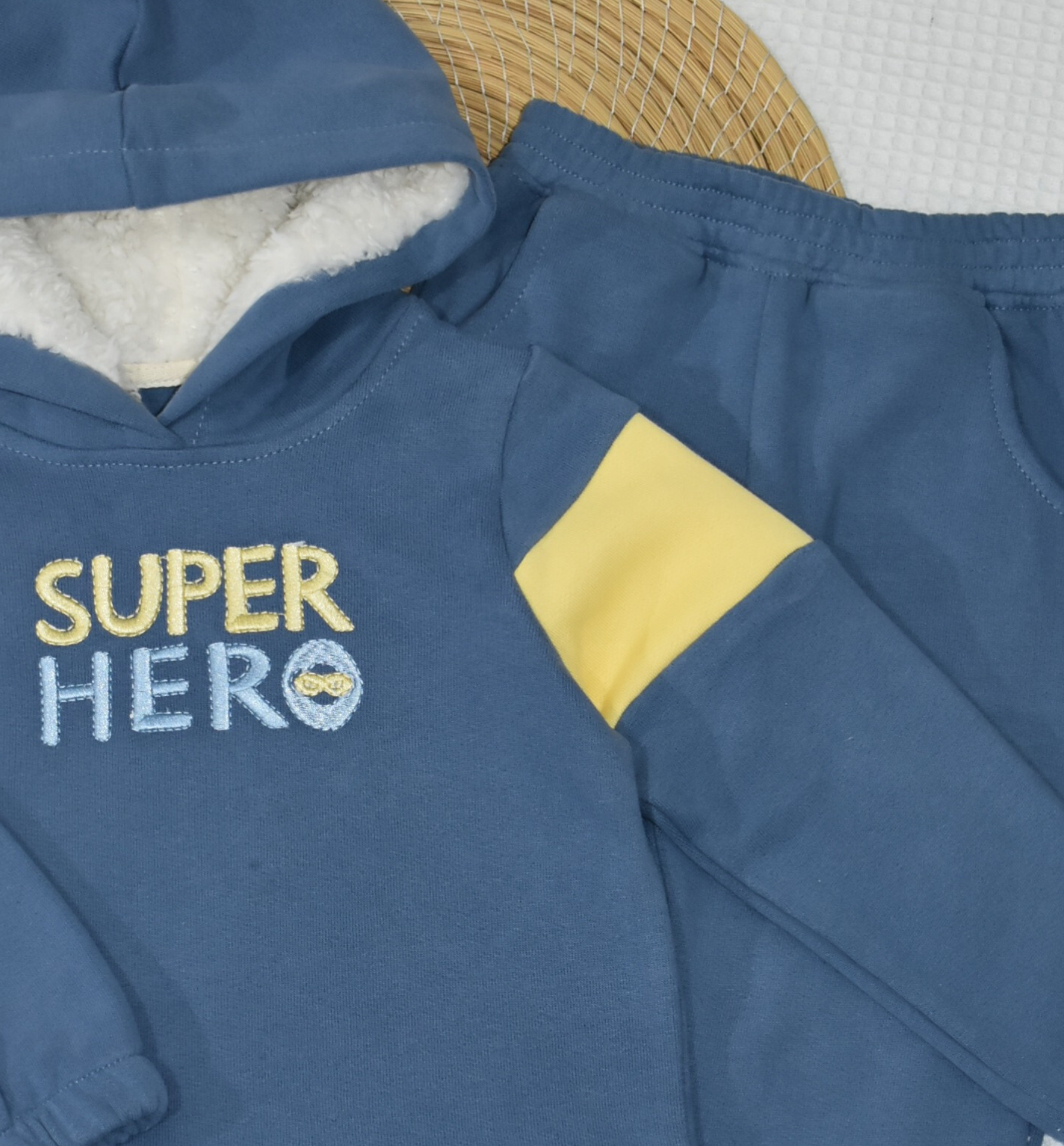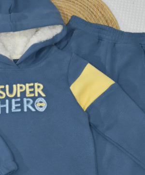Ensemble chaud et confortable pour bébé, en molleton 100% coton gratté ( مبطن ) . Sweat capuche doublée en tissu mouton  ultra-doux, broderie “SUPER HERO”, et pantalon assorti.
