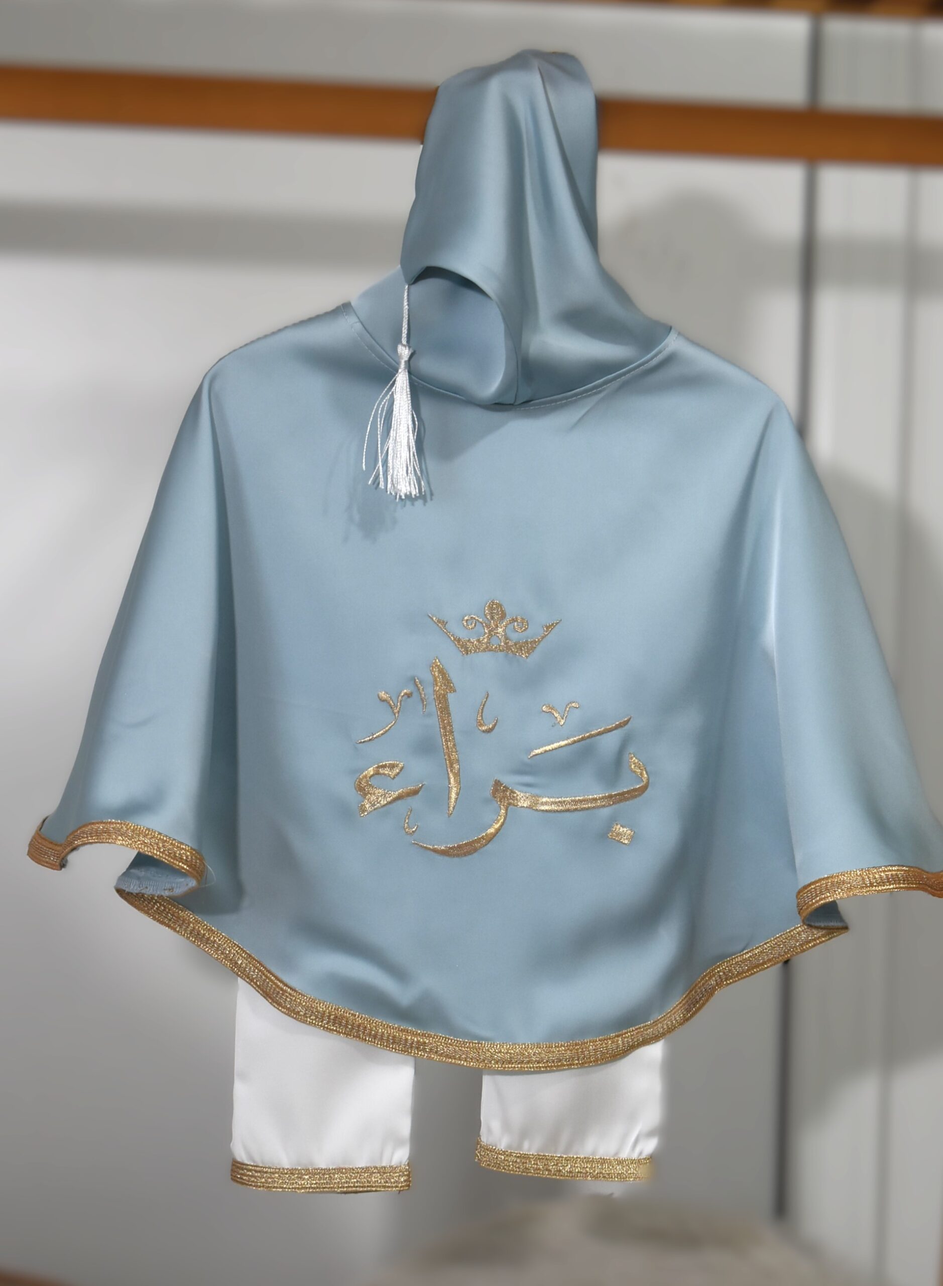 Conçue en satin premium bleu Pastel , cette cape est magnifiquement ornée de broderies dorées, avec une capuche et un pompon finement travaillés. Le tenue en blanc assorti apporte une touche noble et harmonieuse.