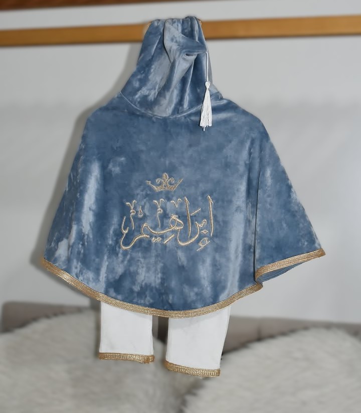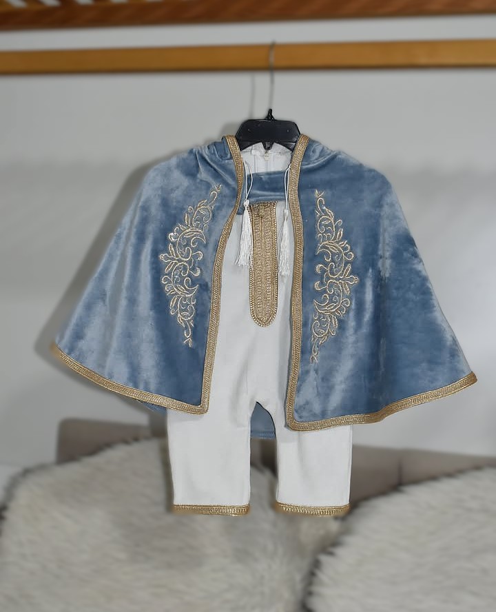 La cape en velours bleu royal, douce comme une caresse, est ornée de broderies dorées délicates qui rappellent les tenues orientales raffinées.